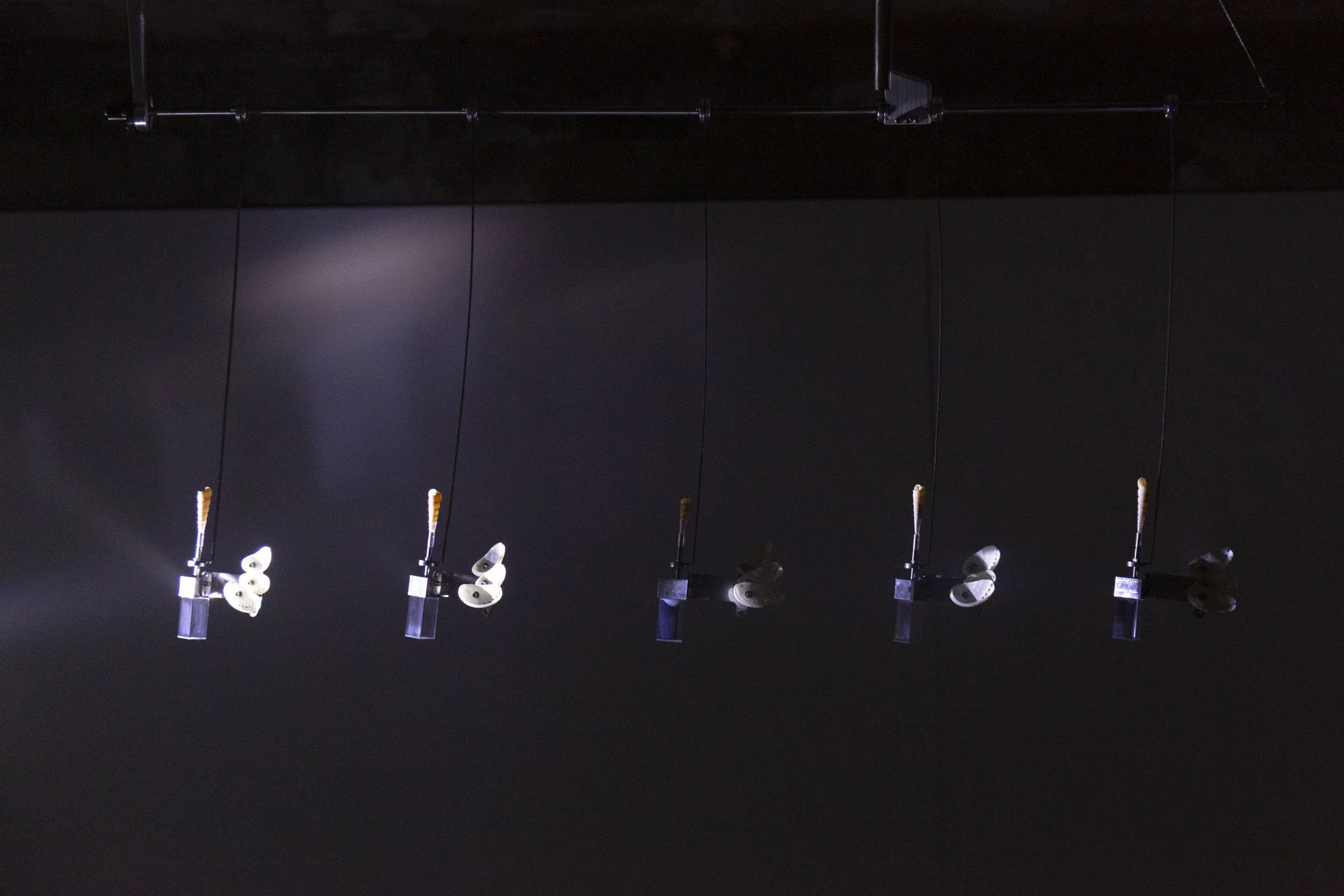 Consciousness of Atmosphere explores how air, light, and invisible environmental energies can be perceived as part of a single organic spatial system. Airflow and solar energy from outside the building are converted into electricity, activating movement and light within the installation. The resulting pendulum motion appears random, yet follows an underlying mathematical order. It functions as the “breath of space,” connecting spatial rhythms with human perception.