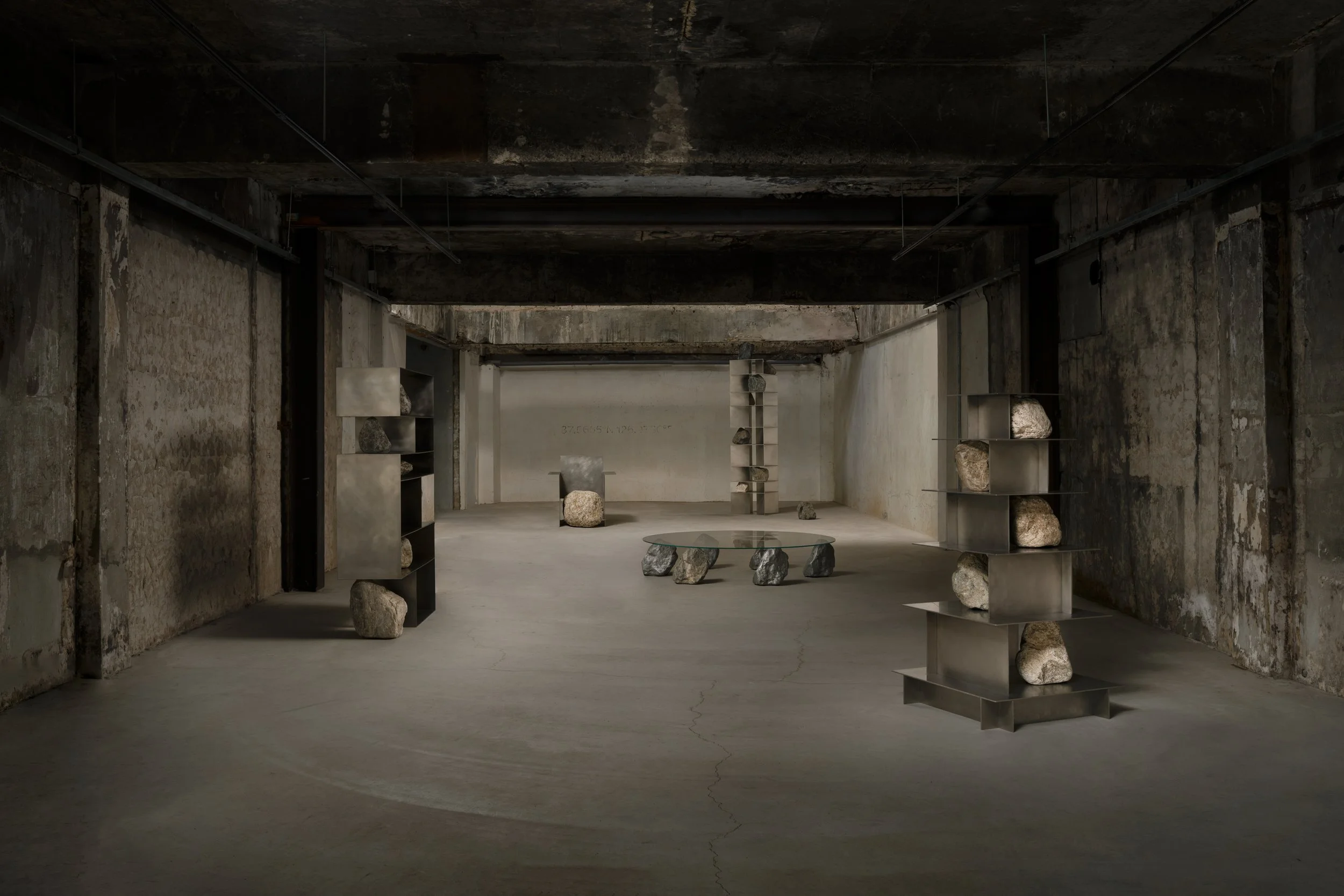Set within a former bathhouse later transformed into a church, the exhibition unfolds in a raw concrete space filled with natural light — where design, architecture, and spatial atmosphere converge.
